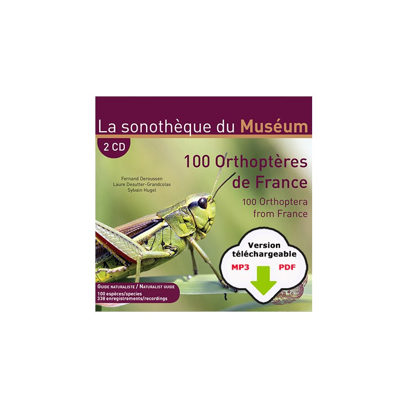2 CD avec 100 fichiers MP3 à télécharger + LIVRET en PDF. Collection "LA SONOTHÈQUE DU MUSÉUM". Les «Guides naturalistes» de la Sonothèque du Muséum ont pour objet de faire découvrir la faune sonore de notre pays. Ce coffret de référence est consacré aux orthoptères : Sauterelles, courtilières, grillons et criquets.